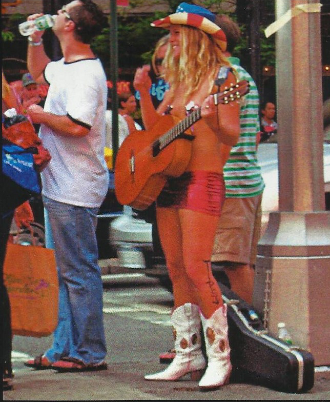 Una chica con un minishort rojo toca una guitarra, con los pechos apenas tapados con estrellitas, en mitad de la calle atareada apenas la escuchan , su cabello es rubio pajizo y su cara enrojecida, lleva un sombrero con la bandera yanqui, se puede ver en eso un patriotismo pesado, pero es al revés, eso demuestra que en Nueva York pocas cosas son solemnes, todo tiene la vitalidad del aire y del pop, la vida está al nivel de la calle, parece el retrato mismo de la vulgaridad pero algo en ella emociona y seduce, tal vez es esa sexualidad tan elemental bajo la prenda chillona, tal vez es su toque de cow girl que se para en la ciudad repleta de gente como una exploradora de las praderas, tal vez es su tocar la guitarra de modo patético como si fuera una juglaresa que va por los ferrocarriles, y en esta ciudad llena de trasiego y de viaje su música ligera la evapora y la convierte en leyenda.