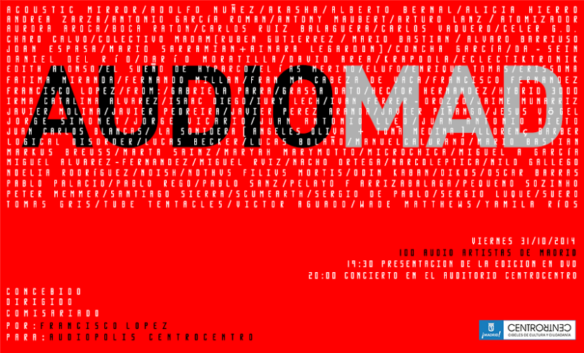 A la presentación de la edición en DVD de audio-MAD. 100 artistas de Madrid, el viernes 31 de octubre, a las 19:30 horas, en el Auditorio de CentroCentro, le seguirá a las 20:00 horas un concierto ejecutado en solitario por ordenador, sin controlador humano, a partir de una selección “recombinada” de materiales de todos los artistas participantes.