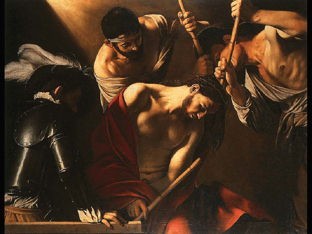 También me impresiona la diferencia entre esta pintura y la Renacentista, que la precede. Este tipo de caracterización es mucho más humana, como vemos en La coronación de espinas – señala el cuadro – Notamos la precisión con la que están haciendo su trabajo los dos del fondo en los músculos del cuerpo, en la concentración de sus caras. El cansancio en la figura del Jesús retratado, y a su vez, la mano que sostiene la caña, como símbolo de fuerza y resistencia; y claro en contraste a estas figuras de esfuerzo, el soldado, acomodado tranquilo, casi burlón, mirando la situación desde afuera, pero muy de cerca.
