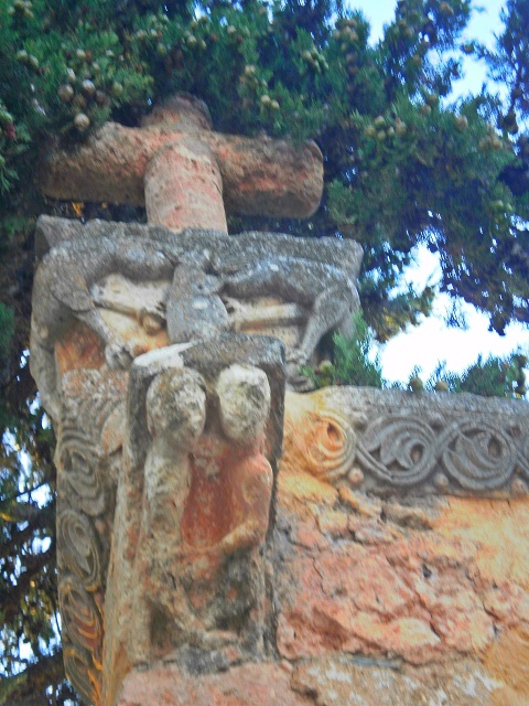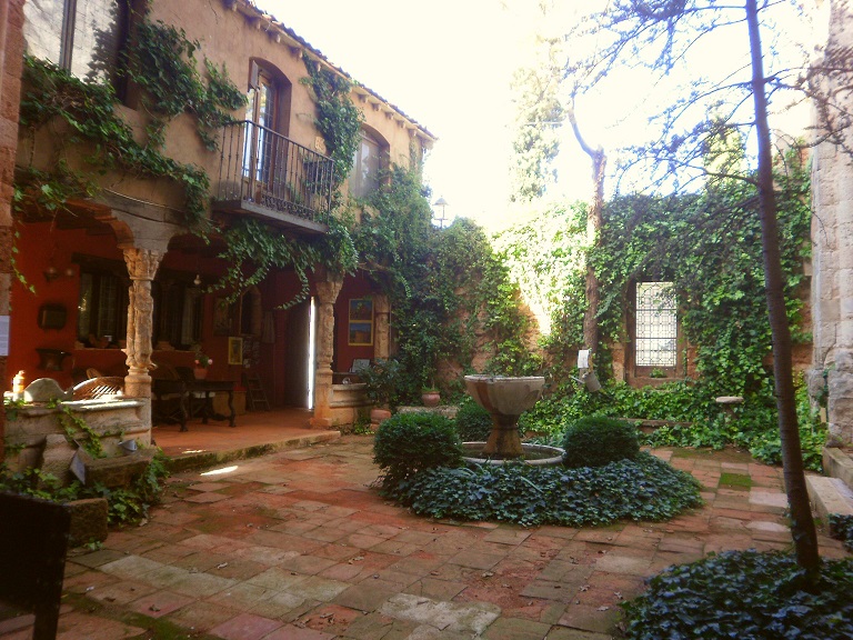 En lo alto se divisa la torre Martina , que es una mezcla de torre y de iglesia, y detrás un abuelo apacienta unas cabras, y debajo en las bodegas que se empotran en la tierra roja me imagino borracheras secretas y pequeñas orgías humildes. En otro extremo del pueblo, en la propiedad de San Juan, vive el matrimonio de pintores Pedro Corrons y Zuzka Daucikova que te enseñan los muros cubiertos por hiedras, las columnas donde se agarran esculturas expresionistas del siglo XII, un cenador bajo una parra sujeta por capiteles románicos, un rincón donde te tiendes en tumbonas de madera o miras un solitario juego de la rana . Y luego te muestran sus pinturas inspiradas en personas sarmentosas del pueblo o su colección de Arte Bruto.