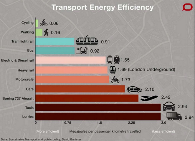 De acuerdo con David Banister, profesor en estudios de transporte, la bicicleta es, entre todos los posibles, el medio de transporte más efectivo a nivel energético. Esto, evidentemente, en términos de megajoules de energía expandida por kilómetro viajado.