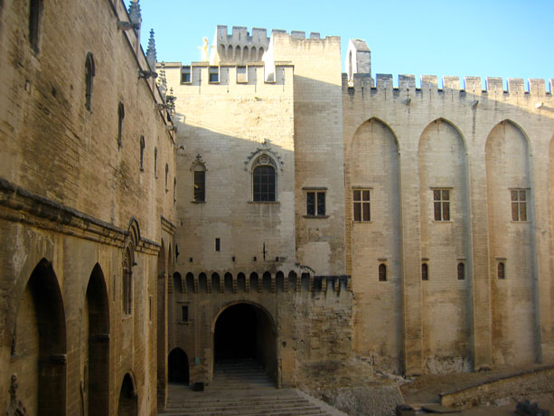 En Aviñón estuvieron los papas durante casi un siglo. Benedicto XII fue un austero cisterciense pero Clemente VI se entusiasmó y levantó el Palacio Nuevo para crear la corte más esplendorosa de Europa. Y tuvo tantas amantes que Petrarca, su protegido, le llamó Dionisos Eclesiástico, y cogió una considerable gonorrea, pero dormía entre dos fogatas para que las pulgas no le estropeasen la piel. Ahora el Palacio de los Papas sirve para que parejas de amantes se paseen contemplando las telas de Simone Martini y las grandes salas vacías sin ningún mobiliario. Por las noches, en la plaza del Palacio , la Luna inventa una furia romántica en el entusiasmo del gótico.