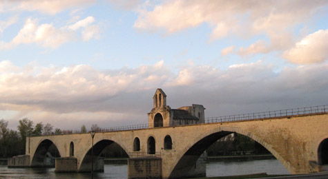 El famoso puente de Saint Benezet ya no sirve para cruzar el Ródano y unir el norte de Europa con el Mediterráneo. Hubo demasiadas crecidas y en el siglo XVII se cansaron de reconstruirlo. Ahora sirve para que los amantes se animen viendo como vibra el agua, alejándose de las rigideces de la tierra. Cuando van allí dos personas una de ellas dice : Aquí ya no tienes escapatoria, o me beses o volvemos atrás. Tal vez eso es lo que significa la canción popular : “ Sobre el puente de Aviñón / uno baila, uno baila. / Sobre el puente de Aviñón/ todos bailan, todos bailan./ Los bellos señores hacen así. / Las bellas damas hacen así” .