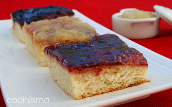 Esta tarta con base de masa de pan dulce está cubierta de tres mermeladas distintas, frambuesa, arándanos y, aunque suene extraño, mermelada de patata.