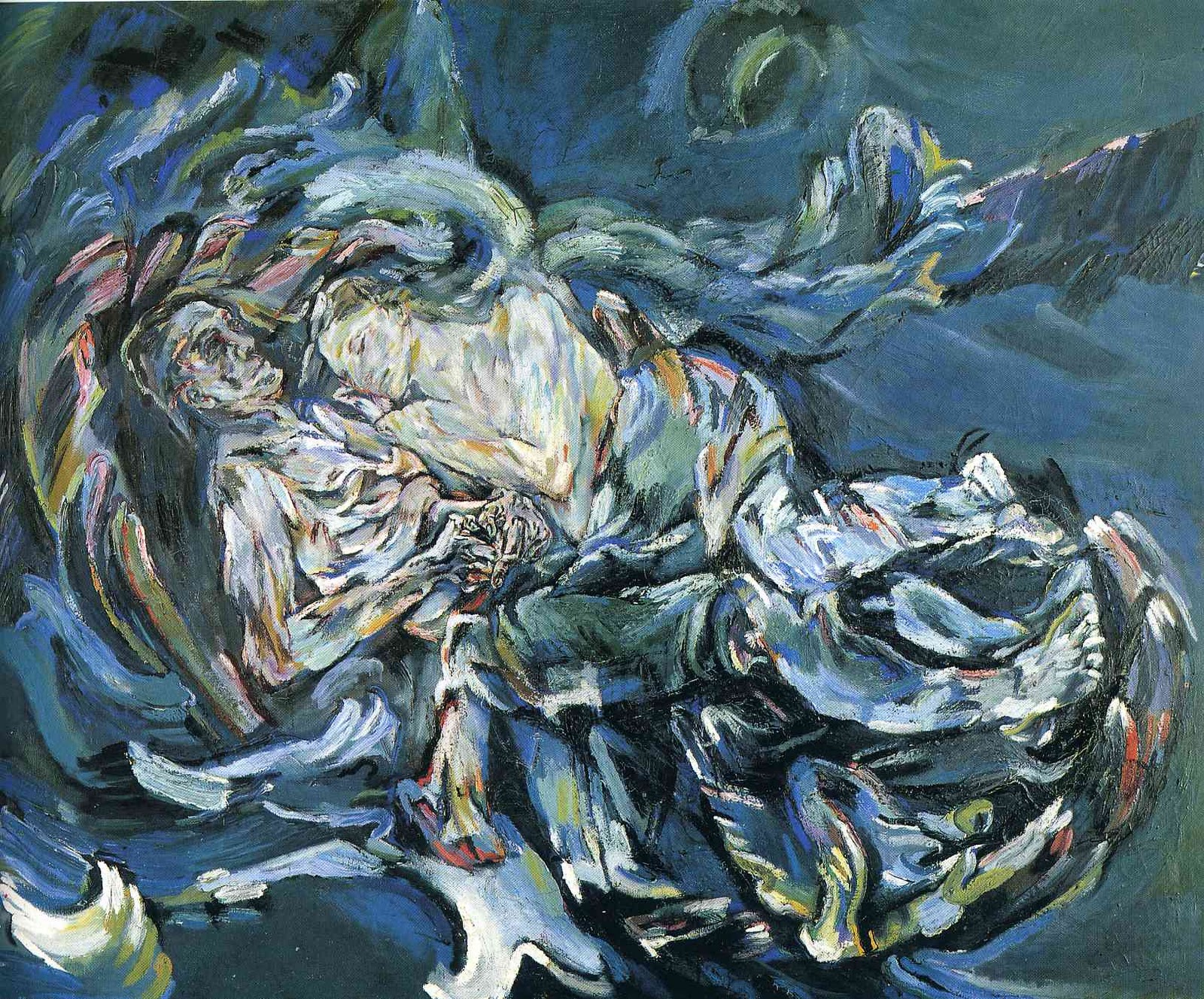 Dicen que “La novia del viento” representa su relación tormentosa con Alma Mahler, una mujer que ya había estado casada con una tormenta que se llamaba Gustav Mahler y a la que representa en toda su fuerza Ken Russell en su película “Mahler”. Los dos estaban enloquecidos en su relación amorosa (“ si utilizas la fuerza de tu alma y la belleza de tu cuerpo entonces tú serás el motivo de mi vida , me darás fuerzas y tú y yo seremos uno”). Pero cuando rompieron Kokoschka quiso decir que sus momentos juntos lo arrasaban todo y perdurarían para siempre. El era el viento pero ella no era menos viento que él. Y los dos agitaban con fuerza la tierra. Y se habían hecho fieles al sentido de la tierra como quería Nietzsche. Se lanzaban al suelo desnudos y desgarrados olvidándolo todo. Desde luego no se parecían a una pareja que vi hace poco en Venecia: ella hablaba durante horas por el móvil y él resignado bromeaba con los niños de una mesa vecina.