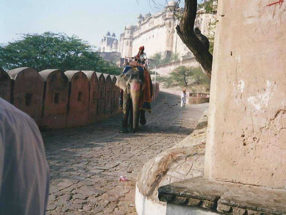 Cuando empezamos a ver la fortaleza-palacio nos impresiona cada vez más. Es en diciembre pero hace calor como si fuera verano en Europa. El conductor me dice que hay varias maneras de subir: en elefante, en jeep, o con el autobús 62. El autobús 62 significa subir las interminables escaleras. Opto por esta última posibilidad. De todos modos el conductor se acerca y me espanta a todos los menesterosos incansables que quieren ofrecerme sus servicios.
