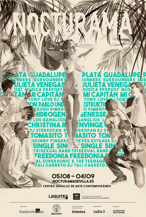 Por último, el artista Manuel León, autor del cartel de Nocturama agosto 2015, no dudó en referirse a su obra como “un cartel pensado para atraer al público, poco pero de calidad, que queda condenado a pasar el verano en nuestra ciudad”. Siempre comprometido con la realidad que le rodea, León buscaba con esta obra “una respuesta al bajo nivel que ha habido en las últimas propuestas cartelísticas de ‘lo oficial’ en Sevilla”. Para él, “cuando nuestra ciudad parece condenada al bello secuestro de la Semana Santa y la Feria (…) Sevilla ya no tiene dos partes, tiene tres, y de esta tercera forma parte Nocturama. La libertad es Nocturama”. Y así ha querido plasmarlo en un cartel que juega con el habitual imaginario de fiestas primaverales, pero tornándolo en una visión mucho más veraniega y despojada de formalismos.