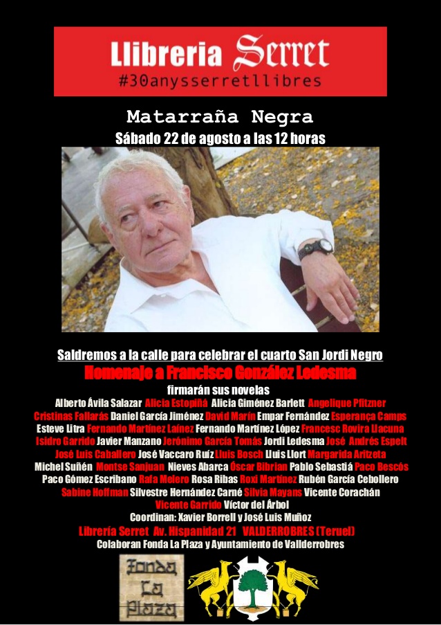 Para este año, además de la firma de libros, Matarranya Negra ha montado una mesa redonda en homenaje al recientemente fallecido Francisco González Ledesma, que nos dejó el pasado 2 de marzo, figura capital de la novelística negracriminal. El padre del inspector Méndez, un atípico y muy humano policía criado en el franquismo, el escritor que, junto a Manuel Vázquez Montalbán, mejor supo recrear un barrio que era el suyo, el Raval—Historia de nuestras calles—, y unas épocas, el franquismo y el postfranquismo, nos dejó este año a los 87 de edad con una producción literaria imprescindible para comprender la evolución del género negro en España. Quien había empezado escribiendo a destajo novelitas del Oeste con la firma de Silver Kane, se convirtió en uno de los grandes de la literatura española y un escritor por todos querido y respetado. Silver Kane, el estejanovista escribano, que, para ganarse el pan, escribió hasta mil novelas populares, se convirtió en Francisco González Ledesma, pero también fue Taylor Nummy, Silvia Valdemar, Rosa Alcázar, Fernando Robles o Enrique Moriel, porque, como todo escritor, era un impostor.