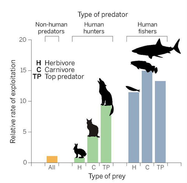 Una investigación canadiense revela una nueva visión detrás de las extinciones generalizadas de fauna: el superdepredador humano, que da prioridad a los beneficios a corto plazo, y provoca cambios extremos en las cadenas de alimentación de todo el mundo. Según los científicos, los humanos tienden a cazar adultos de otras especies en índices hasta 14 veces superiores a otros depredadores, con una explotación particularmente intensa de carnívoros terrestres y peces.