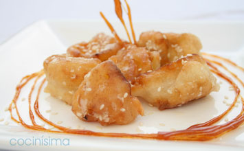 Rebozamos los dados de manzana en la pasta y freímos en abundante aceite, dejamos escurrir el sobrante aceite sobre papel absorbente.