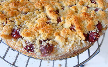 Mezclamos la harina, el azúcar y la mantequilla, con ayuda de un tenedor formamos grumos y cubrimos con esto las cerezas.