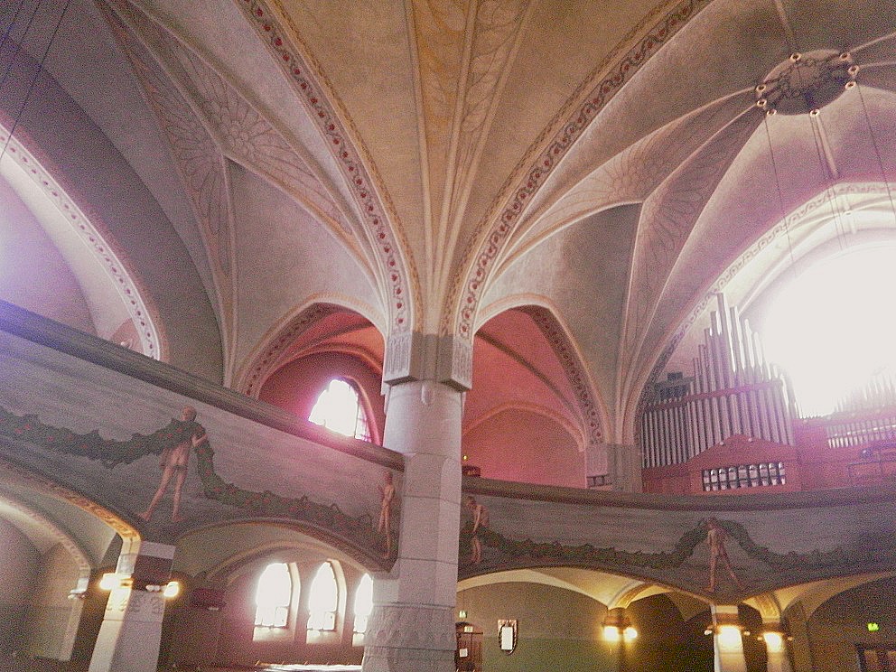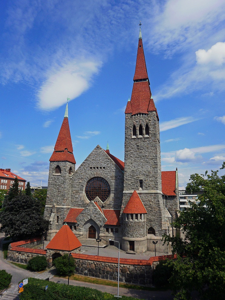 Estábamos en un albergue en que nos cobraban bastante y tuvimos que esperar dos horas para entrar el día de nuestra llegada. Nos daban una llave con un código y a veces llevábamos un susto porque no funcionaba el código. Dentro del cuarto había funcionalidad pero también elegancia de diseño. Esa impersonalidad daba miedo pero luego eran sabrosos los desayunos. Y allí enfrente teníamos la catedral . Era una catedral moderna, de hace un siglo, pero con resabios góticos y audacias de altura. Tenía una gran esbeltez rodeaba de árboles en medio de una elevación . Allí todo tiene que estar rodeado de árboles. Y dentro estaba el fresco El ángel herido de Hugo Simberg que nos gustaba tanto y el Jardín de los Muertos y la procesión de los apóstoles con la corona de la vida. Era una catedral amplia y misteriosa , llena de valentía entusiasta y de fuerza.