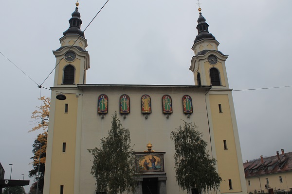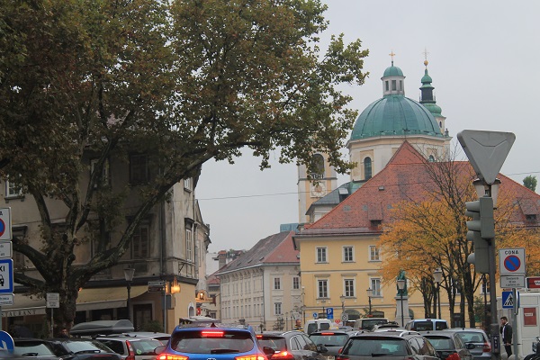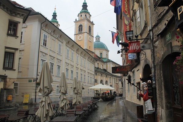 El centro no está muy lejos, media hora andando a buen paso bajo la lluvia que cae, pero tengo la equivocada idea de guiarme por el río Liubliana, que da nombre a la ciudad, y me lleva al centro histórico. Del error de guiarme por el río me apercibo luego. El castillo es una mole oscura que domina la ciudad desde la cima de un montículo de 298 metros y al que se llega por un funicular. Desisto de subir por el mal tiempo. Con el paraguas atrapado entre el cuello y el hombro y la cámara de fotos en ristre, empiezo la exploración de una ciudad que, afortunadamente, no vive del turismo aunque sea tan bella o más que otras muchas que han decidido que ese sea su maná. La cúpula verde suave y las dos torres gemelas de la catedral barroca de San Nicolás destacan por su belleza sobria y el color salmón de su fachada en la plaza de San Cirilo y Metodio, a unos pocos pasos del edificio regio del Ayuntamiento. La plaza Preseren, junto a uno de los historiados puentes que cruzan el río, es el meollo de la ciudad, y allí encuentro la iglesia barroca de los Franciscanos, de fachada rojiza, que compite en prestancia con la catedral.
