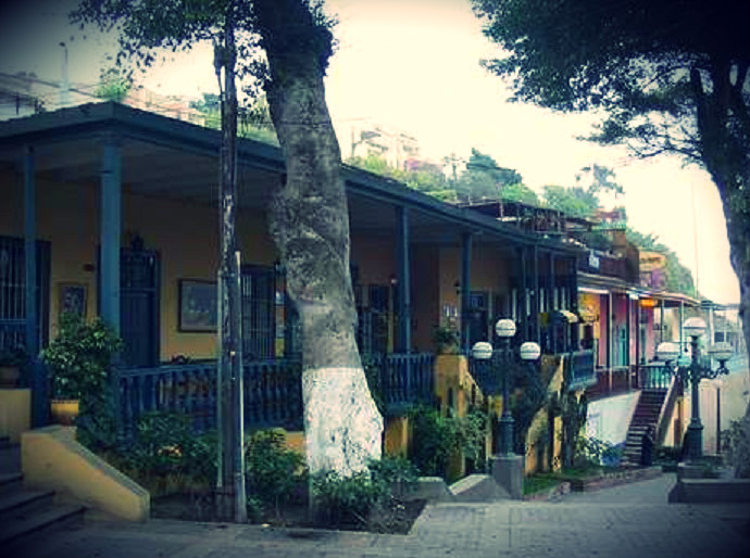 Pero sobre todo no olvido el barrio novelesco de Barranco. Para llegar allí se iba por una carretera de curvas que bordeaba palacetes y pequeños castillos que se entraban por los ojos. Había una iglesia barroca llena de dinamismo y de gracia, la de la Santísima Cruz, con arcos interrumpidos que flotaban en el aire como oberturas, y una torre amarilla que se pavoneaba entre curvas. Había un viejo vagón de tren, el Café Cultural, en el Parque del Municipio , donde tomábamos café en mitad de un viaje imaginario entre ventanas viajeras y a veces había actuaciones de jazz que nos lo volvían todo vibrante y nocturno. Se atravesaba el Puente de los Suspiros, que temblaba encima de calles en descenso y nos ponía al nivel de las ventanas en dirección al mar. Era tan descaradamente romántico que daban ganas de enamorarse de todo. Todas las canciones se volvían ciertas, la vida se convertía en una novela. Y luego se descendía por la Bajada de los Baños entre casas azules y jardines íntimos. Y por un sendero elevado rodeado de piedrecitas y de artesanos bohemios se llegaba a un mirador secreto en el borde de un acantilado donde uno se volvía misterioso y lejano. Cualquiera podría hablar allí como un personaje de película, todos nos volvíamos interesantes. Y se veían parejas de jóvenes silenciosos que sencillamente miraban el Pacífico.