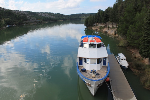 La carretera que parte de Skradin trepa sinuosamente por una montaña, pero a las diez no hay tráfico que valga. Así es que voy solo, despacio, deteniendo la velocidad en las curvas para disfrutar de vistas aéreas. En un puente que cruza el río Krka, que me cuesta saber si es río o lago, detengo mi coche para verlo bien. En ese tramo tendrá una anchura de unos doscientos metros, y el agua, que no se mueve, coge el color verde oscuro de los árboles que crecen en las rocosas montañas de travertino que lo encajonan sin ahogarlo. Hay un barco de río, grande, para pasajeros, amarrado a un muelle metálico y, muy cerca, un camping.