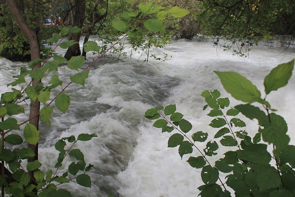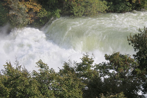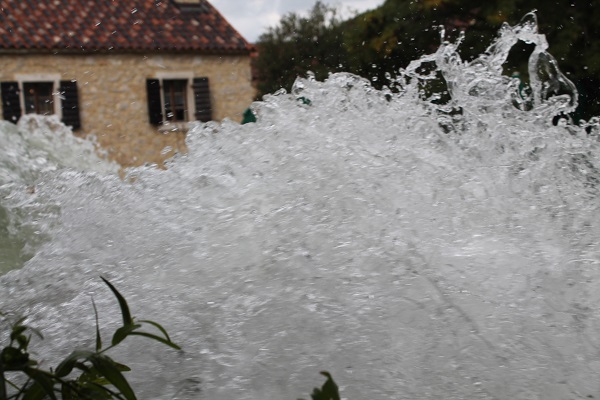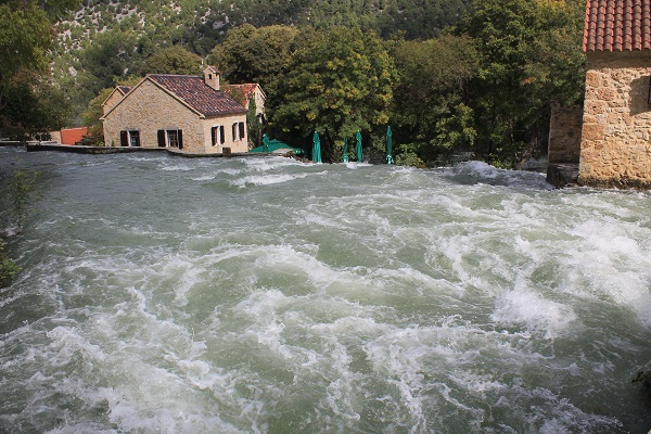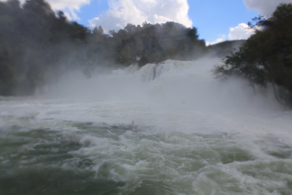 Descendiendo más, fuera ya del molino, cercado por las aguas bravas, cuyas paredes resisten, uno de los miradores me permite contemplar el río, juntados ya los tres ramales en uno, que se precipita como un afluente amazónico convirtiendo la suave cascada que es, en condiciones atmosféricas normales, en una vertiginosa y rugiente catarata. Todo el curso del Krka, descendiendo por la montaña, es una masa espumeante y furiosa que levanta cortinas de vapor de agua y agita las ramas de los árboles con su viento a su paso. El Krka va saltando de terraza en terraza de travertino, pero es tanta el agua que lleva, es tan impresionante la crecida de su curso, que todo él es una pavorosa línea de agua blanca furiosa que parece haber arrasado todo el bosque con su furia. El espectáculo es dantesco. Quedar sin navegar por los lagos tiene esta imprevista recompensa, ver la furia ciega de la naturaleza en todo su esplendor, sobrecogerme por el rugido de las aguas desbordadas. Así es que en ese momento, ante el Krka que no se reconoce ni a sí mismo, doy por bien empleados los días lluviosos, los diluvios por las autopistas, mis paseos encharcados, mi ropa y mi cámara mojada, mis pies fríos.