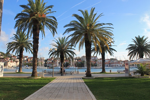 Luce el sol y la pequeña ciudad está muy animada. Recorro el paseo marítimo, cubierto de suelo de travertino y festoneado por exuberantes palmeras, y busco un restaurante para comer en una de las muchas terrazas que se alinean una detrás de otra en feroz competencia. Me apetece comer pescado al lado del mar. Una sopa, y luego el filete jugoso de un pescado acompañado de una salsa bearnesa y arroz pilaf. Para beber pido una Karlovacko de presión. El postre es una panacotta. La influencia italiana persiste en Dalmacia muchos años después de que pasara a formar parte de Croacia.