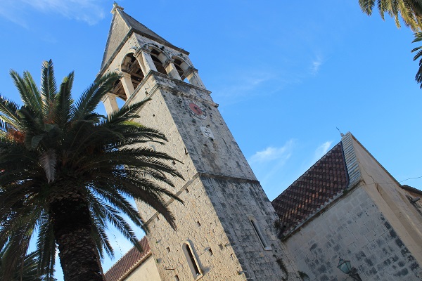 Trogir está a orillas del mar, rozándolo. Dejo el coche en un aparcamiento, pasado un puente levadizo de tres ojos que cruza un canal, en su puerto deportivo, junto a lanchas y fuera bordas que se balancean en un mar tan azul como el cielo, y me aventuro por la población siguiendo la guía del espigado campanario, una aguja que me sigue recordando a los minaretes de las mezquitas: unos y otros, mediante campanas o por la viva voz de los muecines, sirven para llamar a la oración.