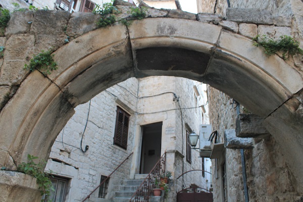 Las calles, peatonales, son estrechas, pero de trazado rectilíneo que impide la pérdida. Abundan en ellas los comercios, las heladerías, los restaurantes y las casas de huéspedes. La piedra del suelo, blanca, se confunde con la de los edificios, creando una sucesión visual que sólo se interrumpe con el azul del cielo. La torre rosácea de una iglesia desvencijada, cuya fachada necesita una urgente rehabilitación, marca el límite de la zona peatonal de Trogir. Cojo otras calles, entonces, de forma aleatoria. Algunas viviendas conservan en sus entradas los dinteles de la época romana que han aprovechado. La puerta abierta de una casa de huéspedes me permite ver un recoleto patio interior y ropa de colores colgada de sus alambres. Hay calles tan estrechas que no permiten el cruce de dos personas; otras que son pasadizos o túneles, pero me llama la atención la pulcritud y la ausencia de grafitis en las paredes, prueba de que sus habitantes aman su ciudad. Hay arcos romanos, perfectamente conservados, y escalinatas antiquísimas que suben hasta la planta de entrada de las casas. Esa sencillez artística del interior de Trogir, con elementos romanos, románicos, góticos o renacentistas integrados en las viviendas, nada tiene que ver con la fachada exterior de su paseo, volcado al turismo. El cielo sigue siendo azul en este pueblo tallado todo el en travertino.