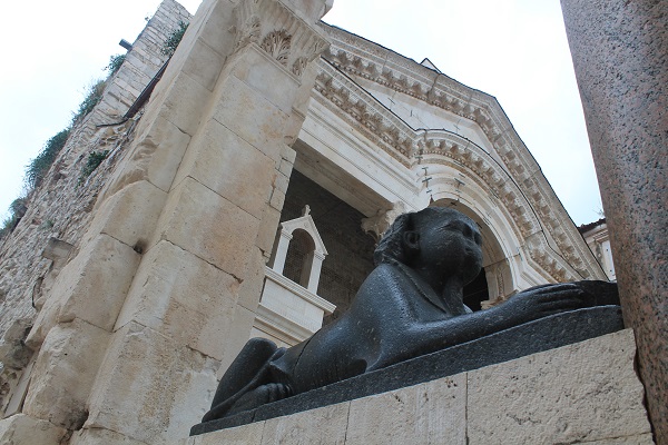 A la salida, enmarcado por el frontispicio triangular del templo romano, una pequeña esfinge egipcia negra domina la situación y mira a los visitantes. En la cripta angosta, húmeda y carente de ventilación, que también se visita, se venera a Santa Lucia, y junto al modesto altar, vigilado por una imagen de la patrona de los ciegos, hay papelitos con cientos de peticiones.