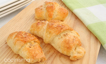 Batir la yema de huevo con la leche, untar los cuernecillos con ella y cubrir con sésamo. Hornear en el horno precalentado a 180º durante 25 minutos.