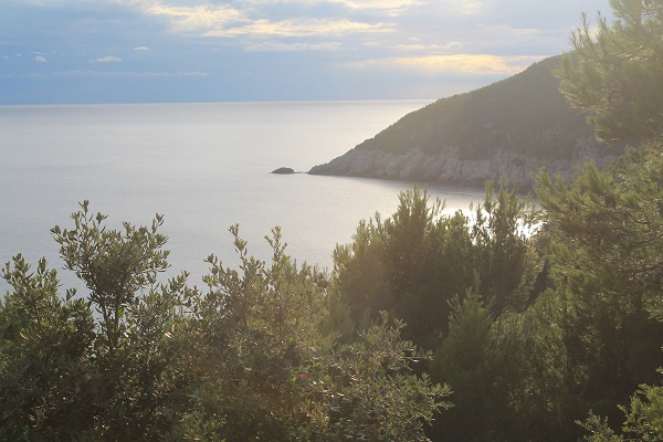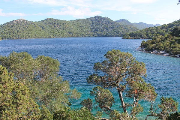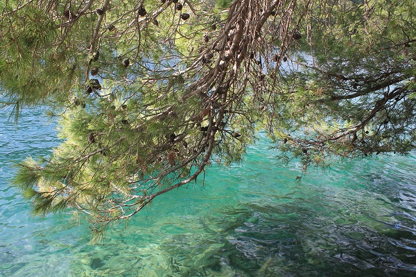 A las cuatro de la tarde, tras ver lo poco que hay que ver de Pomena más allá de sus bonitas panorámicas marítimas desde lo alto de una loma en donde muere la carretera, desando el camino y regreso al aparcamiento del Parque Nacional por el camino que bordea el lago salado grande. Entre los pinos alepienses que se inclinan hasta besar el agua descubro pitas. Y allí, bañándose, me encuentro con el viajero japonés solitario que se hospeda en Polace. Ha dejado amontonados en la estrecha pista asfaltada, por dónde sólo pueden pasar los coches de los que habitan por las inmediaciones, su abrigo bien doblado, su chaqueta, pantalón y camisa, y nada por las aguas transparentes de ese lago. Me da envidia, pero no he traído mi traje de baño. Me lo voy a encontrar de nuevo, ya vestido, camino del pueblo, pedaleando con poca gracia en una bicicleta de alquiler con la que se ahoga en las cuestas. Además, pierde el traje de baño que lleva sobre la barra, para que se seque, y tiene que retroceder a recogerlo del asfalto. ¿Qué hace ese tipo perdido en esa isla?, me pregunto. ¿Qué hace ese señor con barba y muchos años a cuestas en Mjlet?, se debe preguntar el hijo del imperio del sol naciente.
