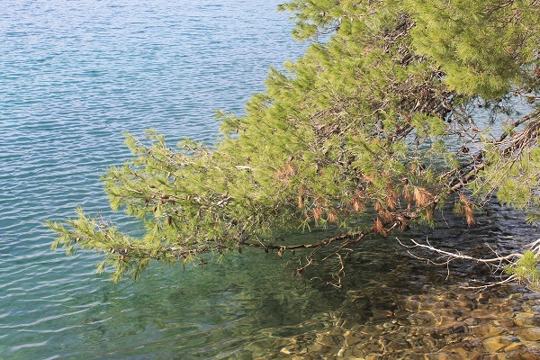 El barquero me recoge a las 12 y me deja en el embarcadero de partida. Un camino que bordea el lago, con pinos alepienses, imagino que de la muy castigada Alepo, que hunden sus ramas en el agua de tan inclinados que crecen, me conduce a un lago menor, también salado, e intercomunicado, y, tras bordear éste, unas escaleras trepan hasta la cima de un montículo y luego descienden hasta la vecina población de Pomena, que está en la costa.