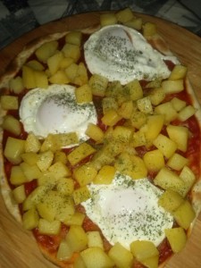 Cuando tengamos todo, montamos sobre la pizza los huevos y las patatas fritas.