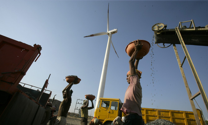 Trabajadores en una explotación de combustibles fósiles frente a turbina eólica. /Land Rover Our Planet