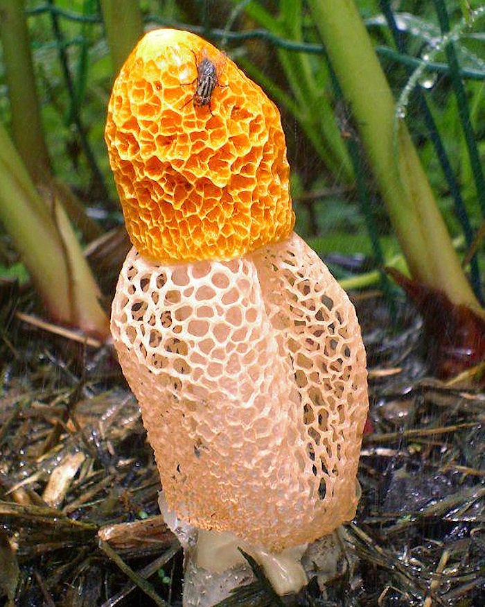 El nombre de la especie del hongo, Dictyophora, se deriva de las antiguas palabras griegas diktyon (“red”) y phero (“dar”).