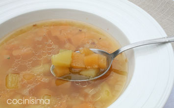 Añadimos el resto del caldo y el tocino, la sal y la pimienta. Dejamos que hierva 20, o, 30 minutos y rectificamos la sal. Retiramos el tocino de la sopa y servimos.
