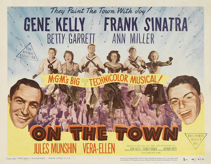 Los primeros papeles en el cine fueron como cantante de las orquestas donde trabajaba, que a menudo se contrataban para películas musicales. Estos filme eran de muy baja calidad pero si repercutían en la cada vez mayor apreciación de Sinatra entre el público de las salas, aumentando visiblemente su popularidad. Estos éxitos en los años de la contienda mundial le llevaron a la cúspide y así se convirtió en un ídolo de los jóvenes, sobre todo chicas, que lo seguían con furor en todas sus actuaciones y que marcó un precedente del mismo fenómeno con la aparición de Elvis Presley y Los Beatles. Todo ello le llevó a firmar un contrato con la RKO para rodar su primera película de la trilogía de musicales con Gene Kelly. La primera fue: Levando anclas ( Anchors Aweigh, 1945, George Sydney) (más tarde la Metro le compró el contrato a la RKO dando los primeros pasos la firma del León Rugiente en la que fue sin duda, su gran aportación a la historia del cine: El musical). Esta película pese su guión muy convencional tuvo un gran éxito de taquilla. En ella Sinatra bailó por primera vez en una película, gracias a que Kelly le enseñó muchos de los pasos, estableciéndose una gran amistad, y de paso a bailar con gran profesionalidad. A la anterior le sucedió otro éxito Llévame a ver el partido ( Everybody’s Cheering, Busby Berkeley, 1949, su última película). En el mismo año Sinatra interpreta, de nuevo junto a Kelly, Un día en Nueva York ( On the town, 1949, de Stanley Doney y Gene Kelly) donde por primera vez aparecen pequeñas escenas rodadas en las calles que abrió definitivamente, con la pareja de directores, a un musical nuevo y revolucionario (con algunas deficiencias de guión no resueltas en los personajes de los actores).