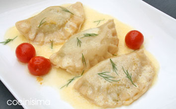 Con el rodillo aplanamos la pasta hasta conseguir una lámina fina y rellenamos con la masa ya preparada, aplastamos los bordes con un tenedor y calentamos en el caldo hirviendo aproximadamente 12 minutos.