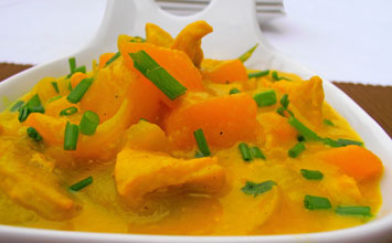En una olla grande fundimos la mantequilla y tostamos la harina, añadimos las patatas, los nabos y las cebollas, removemos y tostamos un poco y añadimos el caldo y la nata, hervimos, tapamos y dejamos cocer 25 minutos, añadimos la carne, la cebolla tierna y la cúrcuma, dejamos 10 minutos más. Salpimentamos y condimentamos con nuez de moscada. Espolvoreamos con cebollino.