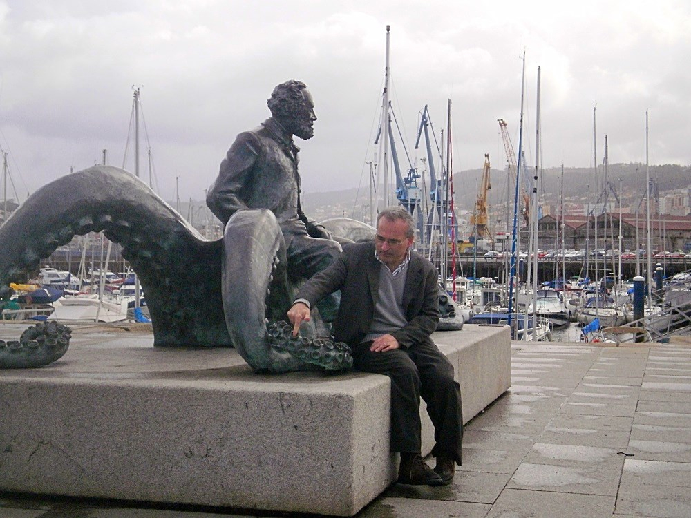 En el puerto está Julio Verne sentado soñando encima de un pulpo con los tentáculos desplegados. Y nos recuerda cuando escribió de todos los mares y de Miguel Strogoff y de viajes fuera de la Tierra. Verne visitó la ciudad a principios del siglo XX. Años después se acercó en barco y quedó alucinado Ernest Hemingway. Y en Vigo Alvaro Cunqueiro pergeñó los viajes de Simbad desde un pueblo gallego hasta el mundo entero.