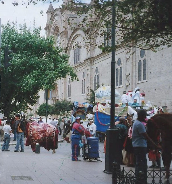 Había un mercado junto a la iglesia de San Francisco, donde viejas con sombreros y camisas azules vendían telas azules, que sorprendía detrás de soportales oscuros, que tenía una vitalidad sin aspavientos, una fantasía de productos y de trajes de colores y de comidas y de paños. Y en aquellos días se celebraba la Fiesta del Niño Viajero una talla de un niño iba en un burro enjaezado con mantas de colores y un rueca azul y delante iban niños vivos danzando con sus faldas giratorias. Todas las gasas de la Historia van soltando su poso de nostalgias, de atmósferas, de sugestiones, y dejan atrás las brutalidades y las mezquindades de cada día. Y así los conquistadores brutales o los imperiales incas acaban teniendo encanto precisamente porque han pasado y han dejado sus alientos más auténticos.
