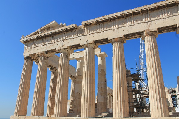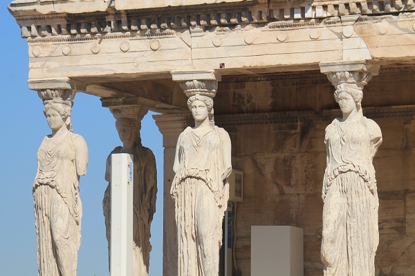 Una chica japonesa de vestido rojo llamativo se cree diosa y se hace fotografiar por su novio encima de una roca, con los brazos abiertos, con el castigado y hermoso templo detrás. Una cariátide de ojos achinados y cuerpo menudo. Las verdaderas cariátides de Erecteón me contemplan impasibles al pasar. Hay viejos que arrastran las piernas, tullidos con piernas metálicas, ciegos, obesos mórbidos que resoplan por esas cuestas y escalones, a veces de resbaladizo mármol pulido, que pasan en disciplinadas hileras entre esas columnas milenarias que se aguantan por simple presión y han contemplado tantas tragedias humanas. Es el Partenón un puzle gigantesco que heredaron los griegos después de los destrozos que en él causaron los turcos con su polvorín bombardeado por venecianos. Cientos de bloques de mármol permanecen en la cima de ese monte, que domina la ciudad, a la espera de que sean clasificados y ubicados.