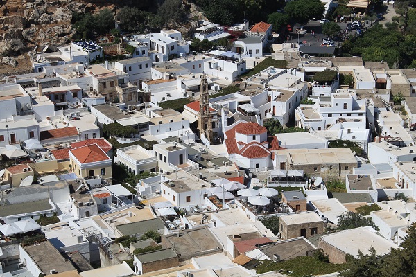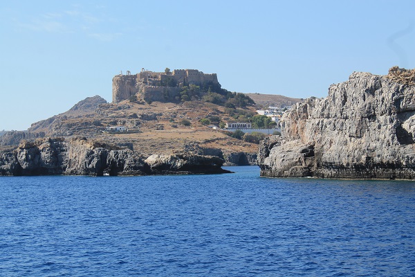 Lindos es una acrópolis majestuosa en la cima de una roca, como la de Atenas, rodeada de una muralla medieval desde donde se domina la población y la cerrada bahía. Los dioses siempre estuvieron cerca del cielo. La población participó en la guerra de Troya, según Homero. Subir desde el puerto, en donde atraca el barco, junto a un arenal lleno a rebosar de pieles blancas, es ligeramente fatigoso, pero las vistas sobre las caletas, montañas y ese mar azul que se tiene desde la cima justifican el esfuerzo de los que no suben a lomos de burro conducidos por los arrieros. De la muralla medieval hay sólidos vestigios; del templo griego, columnas sueltas con las que la imaginación reconstruye la grandiosidad del recinto.