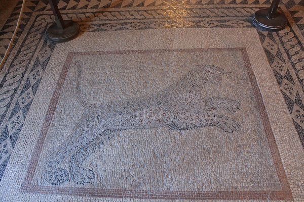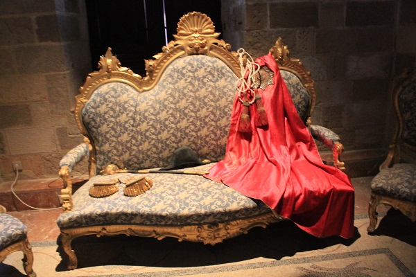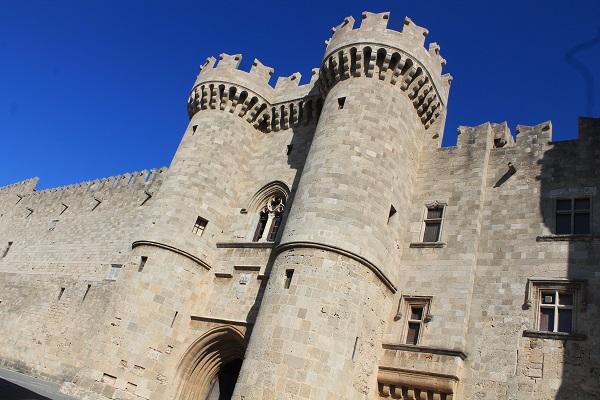 En el enorme patio de armas se alinean en formación perfecta, cada una bajo su correspondiente arco gótico, esculturas helenísticas y romanas de próceres anónimos que fueron rescatadas de las ruinas del templo de Helios sobre el que se asienta el palacio. Una escalinata enorme, tallada en piedra y de dos tramos, sube por el exterior de la plaza de armas a las dos plantas del castillo palacio, pero está tapiada. Mientras pasea por las salas, tras subir por una escalinata imperial que de la planta baja va a la tercera directamente, repara en algo muy lógico teniendo en cuenta el clima benigno de la isla: las chimeneas están todas selladas. Los salones de ese palacio castillo con dos impresionantes torres cilíndricas almenadas que guardan la entrada principal y una cuadrangular en uno de sus laterales, tienen empaque regio, por sus dimensiones, el artesonado de madera oscura del alto techo y los enormes ventanales, pero llama la atención su austeridad. Enormes candelabros, algunos con forma antropomórfica (asexuados ángeles, más femeninos que masculinos), y arañas que cuelgan del techo alumbraban las noches. En vez de alfombras, en el suelo se conservan exquisitos mosaicos de la época romana con gladiadores luchando contra fieras, figuras de animales (leopardos y peces) y el inevitable Helios, el dios sol que sigue reinando sobre los cielos de Rodas, todos traídos de la isla de Kos.