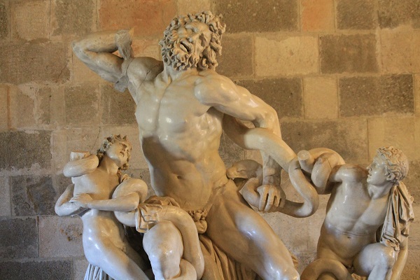 Todo lugar tiene su joya de la corona, aunque no sea genuina sino impostada, y el del palacio castillo de los Caballeros de Rodas es, sin duda, la escultura del Laooconte, el sacerdote de Troya al que los dioses enviaron serpientes para matarlo, a él y a sus hijos, y así no alertara del famoso caballo. Cuentan que el desconfiado sacerdote dijo a los suyos: Desconfío de los griegos, incluso cuando traen regalos. La diosa Atenea le envió dos serpientes, Caribea y Porce, para acallarlo. Pasa el tiempo sin que advierta su discurrir admirando esa réplica (el original, obra de Agesandro, Polidoro de Rodas y Atenodoro está en los Museos Vaticanos) llena de movimiento y en la que la torsión de los tres cuerpos, el del padre y sus hijos, magnifican la angustia ante la muerte y la rabia ante el silencio. ¿Qué podemos hacer los humanos ante el designio de los dioses?