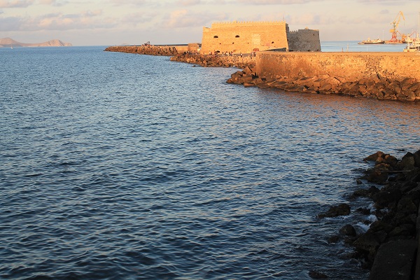 Del aeropuerto cercano despegan aviones y estos se alzan sobre el puerto, en un giro brusco hacia arriba, casi al mismo tiempo que entran trasatlánticos, ferris y otras embarcaciones más pequeñas, no porque Heraclión merezca ser visitada sino porque es el puerto más grande de la isla, el de entrada en ella, pero antaño, esta ciudad portuaria fue muy codiciada. Los turcos, en 1648, la sitiaron nada menos que durante 21 años (la muralla veneciana en forma de estrella, de la que quedan restos devorados por la moderna urbe, llegaba a medir 40 metros de anchura) y sacrificaron por ella nada menos que 70.000 vidas por 38.000 cretenses.