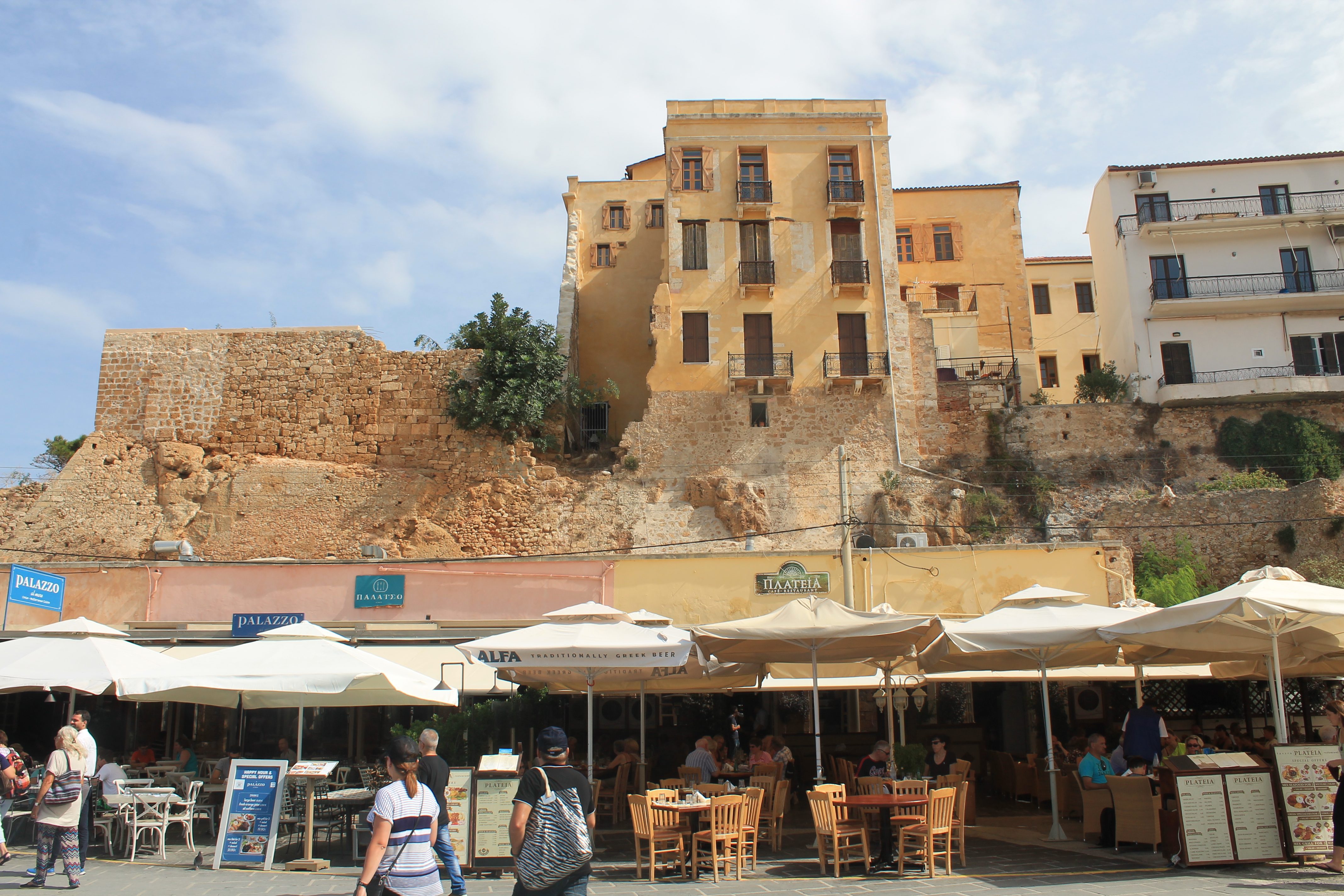 Rétimo era un puerto veneciano que tiene una muralla bien conservada y un dédalo de callejuelas entre las que se vislumbran minaretes de antiguas mezquitas en donde ya no hay culto. No tiene hambre Ulises, pero sí sed, así es que se detiene en un restaurante junto al mar y pide unos calamares aceptables y unas cuantas cervezas Mythos que van cayendo a más ritmo que el cefalópodo frito a la andaluza, es decir, con una capa de harina y sal. El mar, calmo y cristalino, tampoco invita al baño porque hay demasiadas rocas, tienen todas peligrosas aristas que le serrarían las plantas de los pies y tiene la sensación de que hay manadas de erizos en el fondo, así es que ese día tampoco se sumerge en el Egeo, a pesar de que lleva el traje de baño puesto. Así es que después de comer, con Helios que da una tregua ligera gracias a Eolo, pasea por el puerto flanqueado por edificios color pastel y termina sentado en el cómodo diván de un chillout acompañado de un zumo de naranja y una Panna Cotta, el exquisito flan de Mascarpone, por si existían dudas de la impronta veneciana de la ciudad.