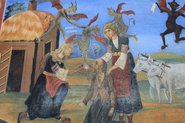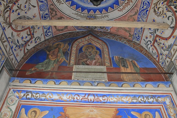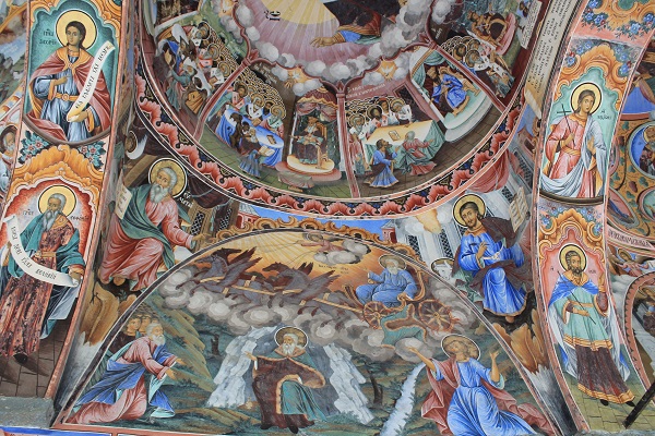 Cuando traspasa el arco de la entrada, Ulises queda deslumbrado por ese enorme monasterio bizantino cuya templo luce con arcos pintados con franjas simétricas en blanco y negro, acebradas, que dan al conjunto un aire árabe. El interior de esa arcada exterior, que rodea la iglesia del monasterio, es una especie de capilla Sixtina del arte bizantino en el que no ha quedado un solo espacio por decorar. Escenificaciones de milagros, tentaciones de diablos, representados como repugnantes murciélagos, hechos relevantes religiosos e iconos de santos y patriarcas decoran muros exteriores y techo de la iglesia obra de los maestros de Samokov y Bansko. El interior de la iglesia Rozhdestvo Bogorodichno, como todo templo ortodoxo, huele a incienso y está sumido en la semipenumbra de las velas y la luz tenue de una inmensa araña central que cuelga de la más grande de las cinco bóvedas que tiene. Tampoco queda en el interior un solo espacio sin decorar con pinturas murales que emplean el pan de oro, pan de oro que brilla también en los retablos de madera repujada con trenzados geométricos de inspiración islámica.