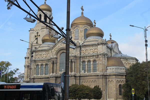 Sigue ese paseo y deja atrás casas pintadas en color pastel, algunas que dañan la vista (hay una de un verde indefinible que le llama la atención) y otras sencillamente despintadas que precisan un arreglo urgente en su fachada. Cuando llega por ese paseo a la plaza Cirilo y Metodio, en donde está la catedral del siglo XIX de la Asunción de la Santísima Madre, se pregunta al traspasar la puerta de ese enorme edifico eclesiástico con cinco cúpulas de forma bulbosa recubiertas de cobre y estaño y altas paredes si es de confesión católica u ortodoxa. Ortodoxa heterodoxa, si se le permite el juego de palabras a Ulises, puesto que le dejan hacer toda clase de fotos y videos, y además hay tres sacerdotes en la iglesia con sotana y aspecto de modernos (uno lleva el pelo largo recogido en coleta) que no parecen popes sino curas. Pero lo que le llama la atención a Ulises es que dentro del templo, frente a su altar oculto, hay una especie de bufet frio tipo desayuno de hotel, y los feligreses y los curas se están dando un gran festín mientras beben tazas de café. Había visto Ulises repartir sopa en los claustros de las iglesias anglicanas del Reino Unido, pero nunca un banquete en el interior de una iglesia, y menos ortodoxa. Tentado está de acercarse a coger uno de esos apetitosos bollos rellenos que están comiendo las beatas, haciéndose pasar por búlgaro, pero la cámara de fotos le delataría.