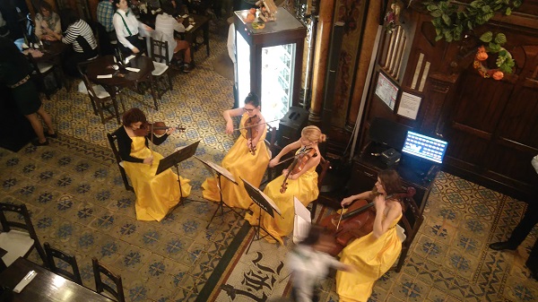 Cuatro horas andando es mucho y hay que reponerse y esa calle estrecha le ofrece la segunda sorpresa. Ve un restaurante de terraza exquisita al lado del cerrado y emblemático Negresco, el Caru cu Bere, e intuye un interior espectacular, así es que entra para comer. La intuición no le falla. El Caru cu Bere, que ocupa un local histórico del siglo XIX, del esplendor de Bucarest, perteneciente a la familia de rancio abolengo Nicolae Mircea, tiene el aspecto de cervecería muniquesa a la que hay que sumar un glamour extraordinario que solo se ve en París o en Viena. El local, abierto desde 1879, tiene techos de trabajado artesonado, cristaleras con vitrales emplomados con figuras exquisitas del noucentismo, paredes decoradas con murales, columnas de mármol rosáceo, y, en la planta de abajo, una orquesta de señoritas, del conservatorio de música, ataviadas con vestidos de organdí dorados, que interpreta con sus violines obras de Schuman, Tchaikovski, Brahms para los comensales. El local, dos plantas (desde la superior se tiene una buena visión de las concertistas y de una barra de bar situada en el centro), está abarrotado, pero una elegante camarera uniformada le consigue una mesa en una esquina. El menú es una especie de periódico de época, y nuestro viajero, que ha entrado a ver más que a comer, elige lo más sencillo, así es que Ulises saborea una exquisita sopa gulasch, una buena cerveza de barril y un flan casero enorme mientras escucha una rapsodia húngara y El capricho italiano.