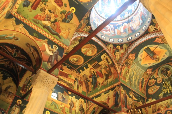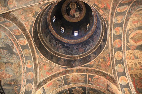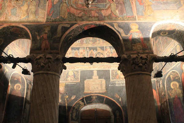 En una pequeña calle de ese centro histórico de la ciudad descubre dos de sus más extraordinarias joyas. La Strada Stavropoleos, nombre que le suena a griego a Ulises, es una pequeña calle peatonal que nace en la Strada Smârdan y muere en la Calea Victoriei. En una de las esquinas, casi oculto por el edificio de estilo neoclásico que alberga el Banco de Crédito Rumano y enfrente de un edifico de fachada limpia de inspiración versallesca, con balconadas historiadas decoradas con esculturas y columnas dóricas, está la diminuta basílica Stavropoleos, Liliput en esa calle de gigantes arquitectónicos. Bajo arcos, que parecen de inspiración turca, y enmarcados por cuatro columnas, el diminuto nártex está decorados por murales exquisitos cuyo colorido han ido atemperando los siglos. El interior, de planta cuadrada, es una miniatura abigarrada de extraordinarias pinturas murales que cubren sus paredes hasta la cúpula tras cruzar tres arcos sustentados por dos columnas dóricas, y ante el santuario resplandece un iconostasio con veinte pequeños iconos enmarcados en una arquería dorada de madera en altorrelieve y cuatro iconos grandes. Solo en ese reducido recinto, Ulises llega a una especie de éxtasis místico contemplando esas minuciosas pinturas, que son como escenas cinematográficas de la narración cristiana, y se sienta en uno de los bancos para digerir tantísima belleza. Sin duda ha visto iglesias ortodoxas más espectaculares, pero es la de Stavropoleos una de las que más gratificación le causa. Definitivamente las iglesias ortodoxas rumanas son verdaderas pinacotecas en donde la vista se pierde en la infinidad de detalles de sus frescos.