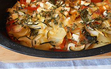 Pelamos y cortamos la verdura finamente y la añadimos en capas, añadimos al tomate y un poco de miel, colocamos todo en una cazuela apta para el horno engrasada, añadimos los quesos y salpimentamos.