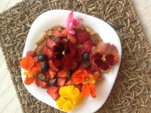 Una vez listo emplatamos y podemos poner todo tipo de frutos rojos a trocitos, plátano y pétalos de flores comestibles. También podemos poner chips de coco sobre los frutos rojos, un poco de chocolate líquido… Eso va al gusto de cada uno.