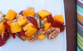 Pelamos y cortamos el mango en cubos pequeños. Secamos y cortamos los boquerónes en trozos. Picamos el chili y rallamos el jengibre. Cortamos la remolacha en trocitos. Preparamos la vinagreta con el resto de los ingredientes. Juntamos todo y dejamos en frío 30 minutos.