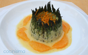 Cocemos 200 gr de esparragos de 5 cm de longitud. Repartimos con sumo cuidado en los aros manteniéndolos de pie en todo el contorno. Llenamos de mousse de espárrago hasta la altura del círculo, las puntas deben superar 1 cm el contorno.